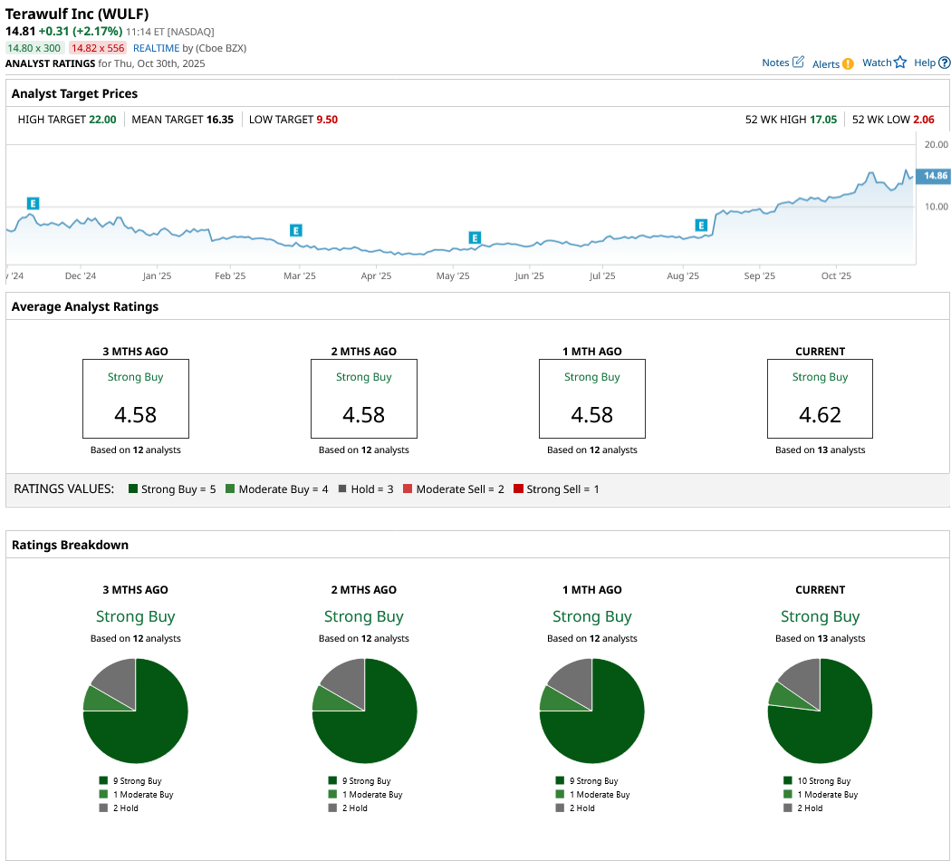As TeraWulf surges ahead, analysts have given WULF stock a consensus “Strong Buy” rating with a mean price target of $16.35, reflecting an upside potential of 10.4% from the market rate.