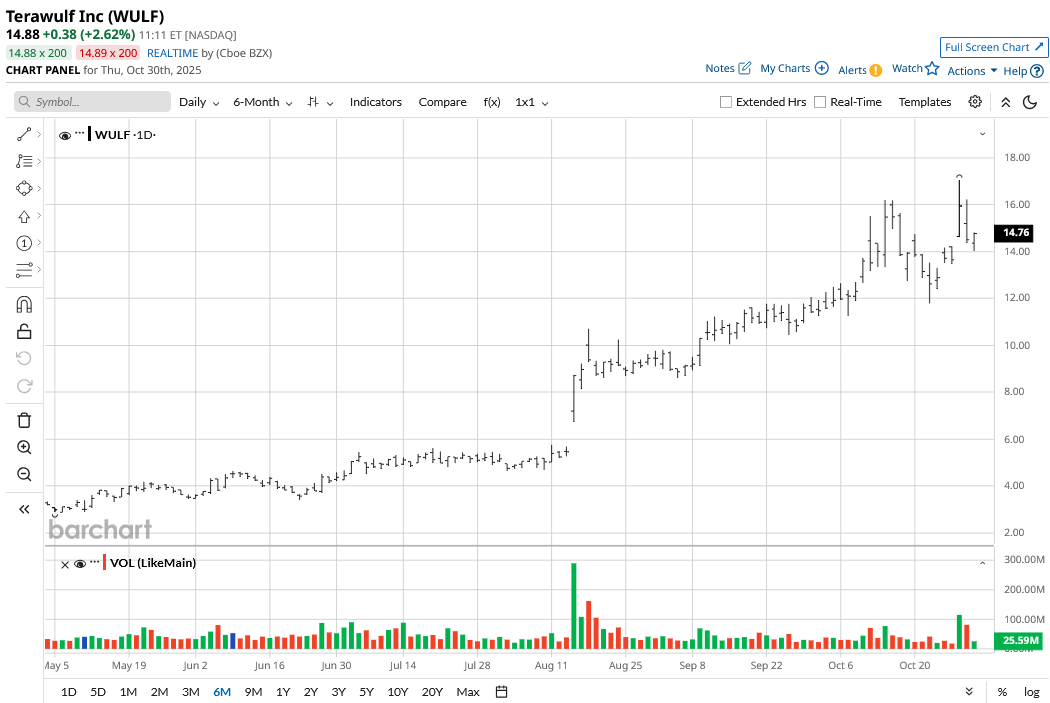 WULF stock has displayed strong performance in 2025, gaining approximately 12% over the last five days and surging over 26% in the past month. The six-month return stands at over 418%, while its 52-week gain is 109%, significantly outperforming the Russell 2000 Index, which posted modest growth under 12% during the same period.