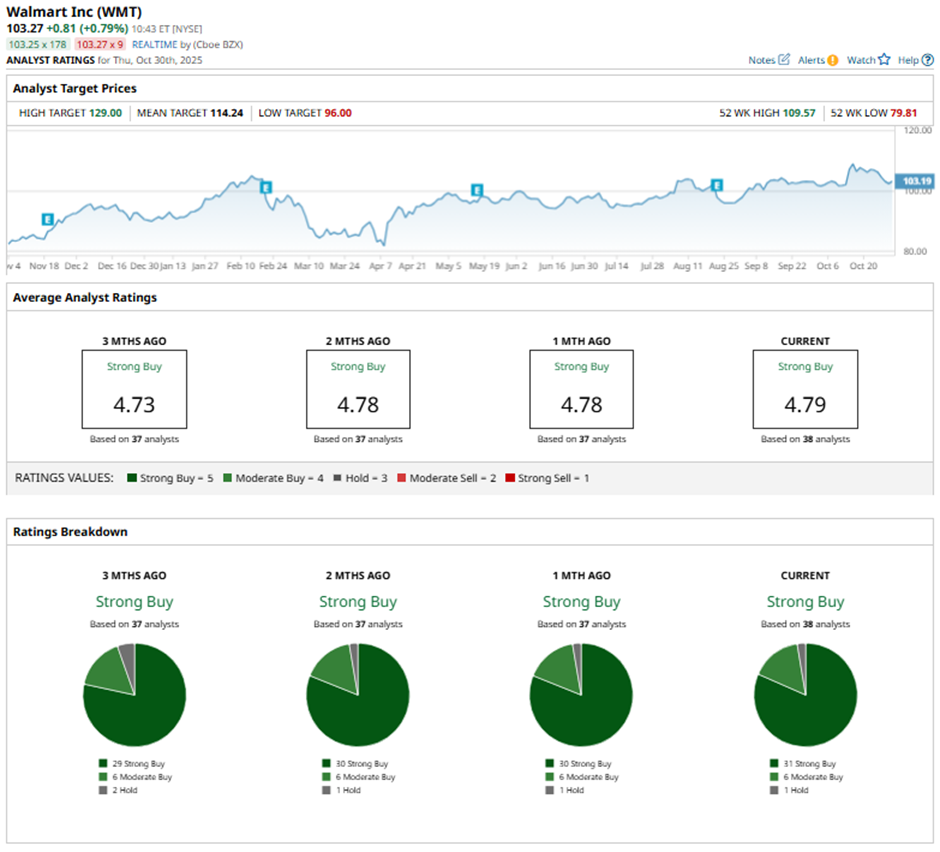 On Oct. 30, RBC Capital analyst Steven Shemesh reaffirmed a “Buy” rating on Walmart, maintaining a price target of $116.