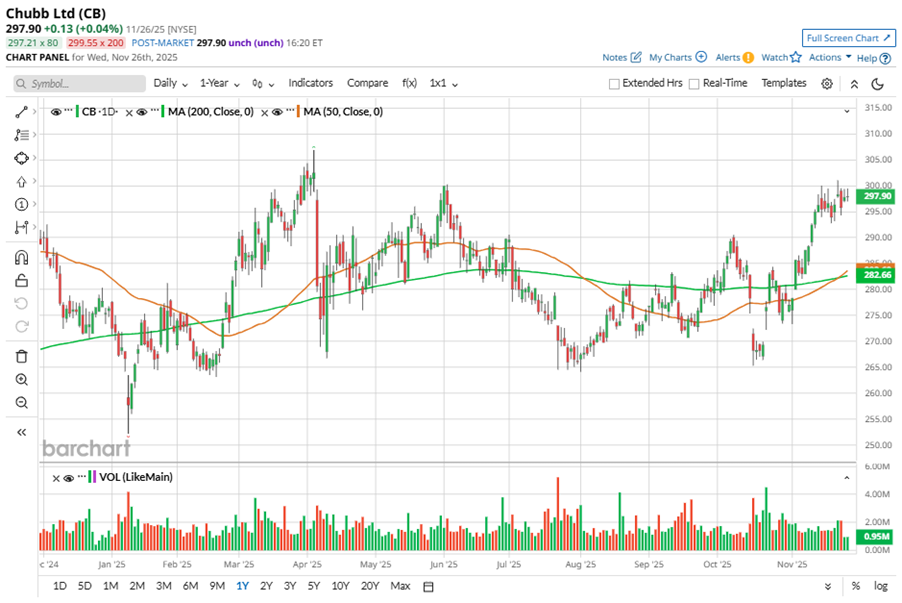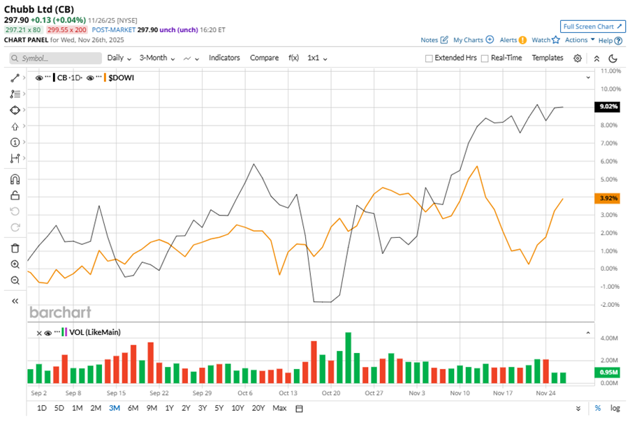 Despite its notable strength, CB slipped 2.9% from its 52-week high of $306.91, achieved on Apr. 3. Over the past three months, CB stock gained 9.5%, outperforming the Dow Jones Industrials Average’s ($DOWI) 4.4% gains during the same time frame.