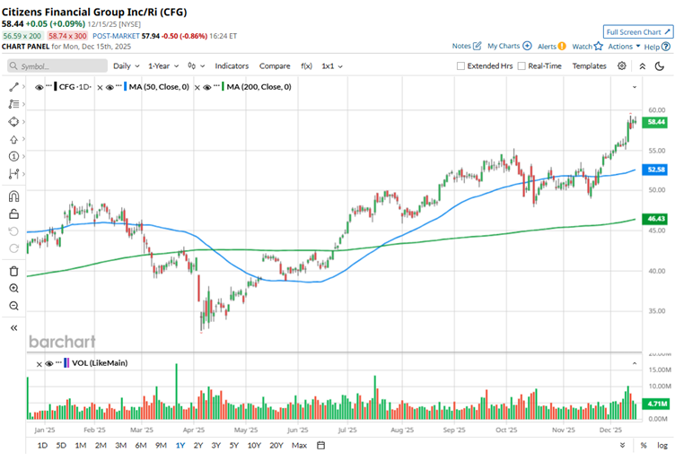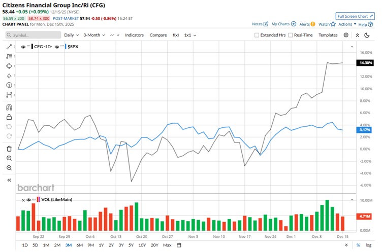 Citizens Financial ranks among the nation’s oldest and largest financial institutions, with total assets of about $222.7 billion as of September 30, 2025. The financial firm is performing quite well on Wall Street, with shares up almost 13.8% over the past three months, easily outpacing the broader S&P 500 Index’s ($SPX) roughly 3% gain over the same period. In fact, the stock reached a new 52-week high of $59.31 on Dec. 11 and is only down 1.5% from that level.
