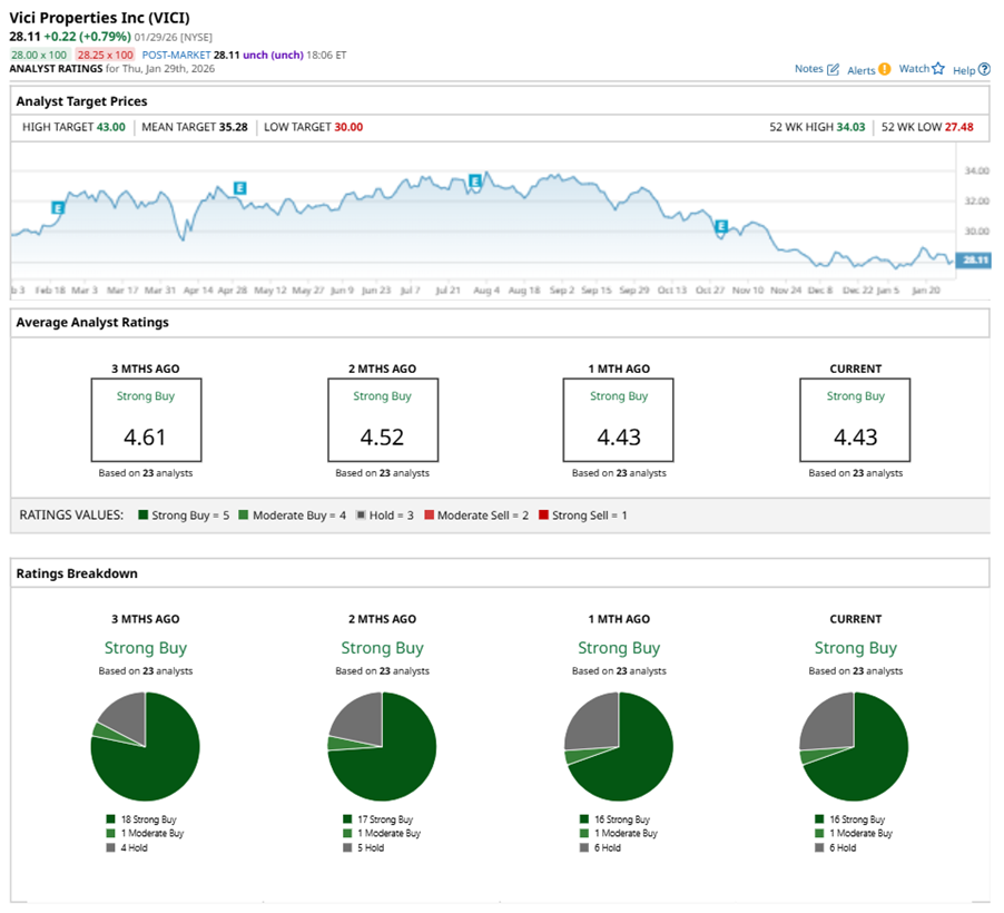 Among the 23 analysts covering VICI stock, the consensus is a “Strong Buy.” That’s based on 16 “Strong Buy” ratings, one “Moderate Buy,” and six “Holds.”