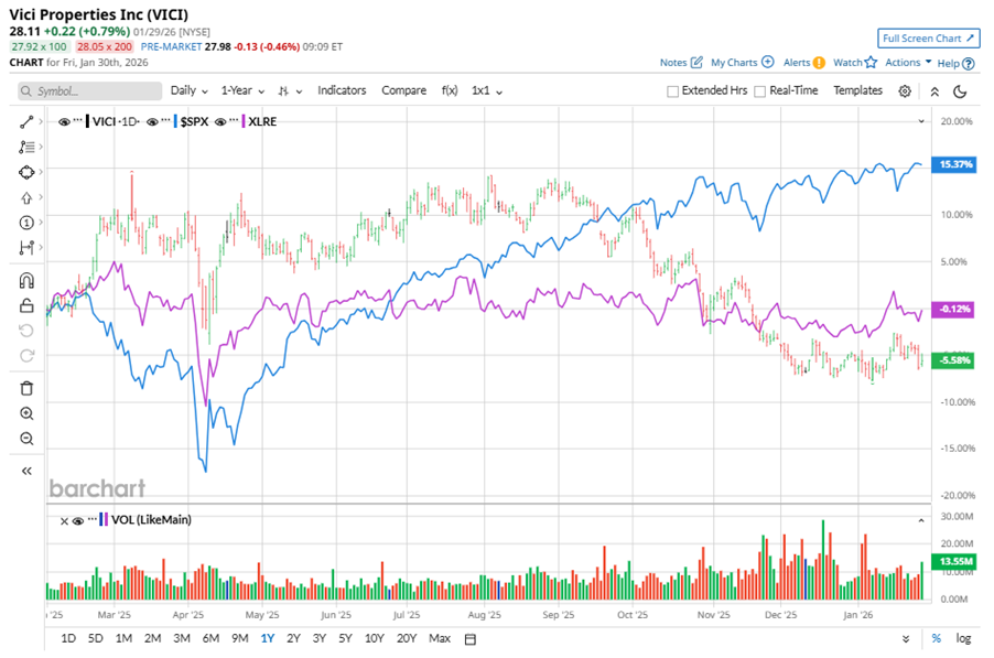Shares of this diversified commercial REIT have underperformed the broader market over the past year. VICI has declined 6% over this time frame, while the broader S&P 500 Index ($SPX) has rallied nearly 15.4%. In 2026, VICI stock is down marginally, compared to the SPX’s 1.8% rise on a YTD basis.