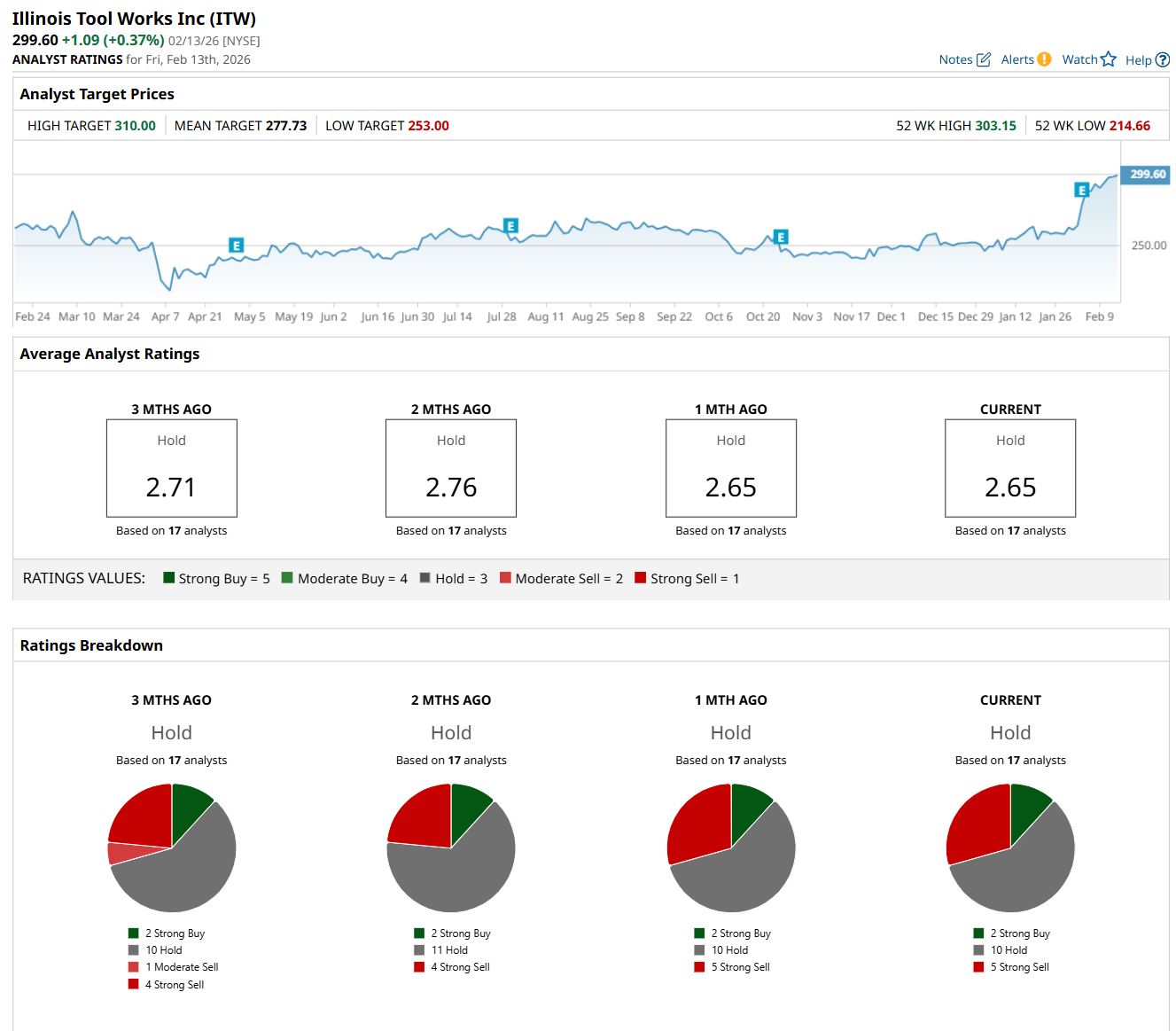 On Feb. 9, Barclays PLC (BCS) analyst Julian Mitchell maintained an "Underweight" rating on ITW but raised its price target to $275.