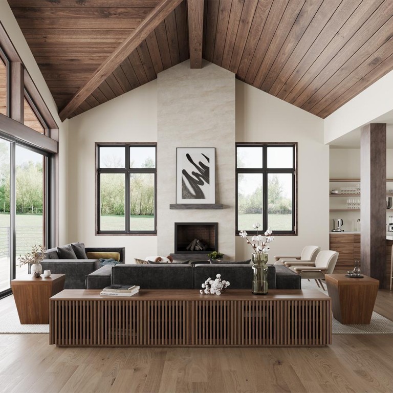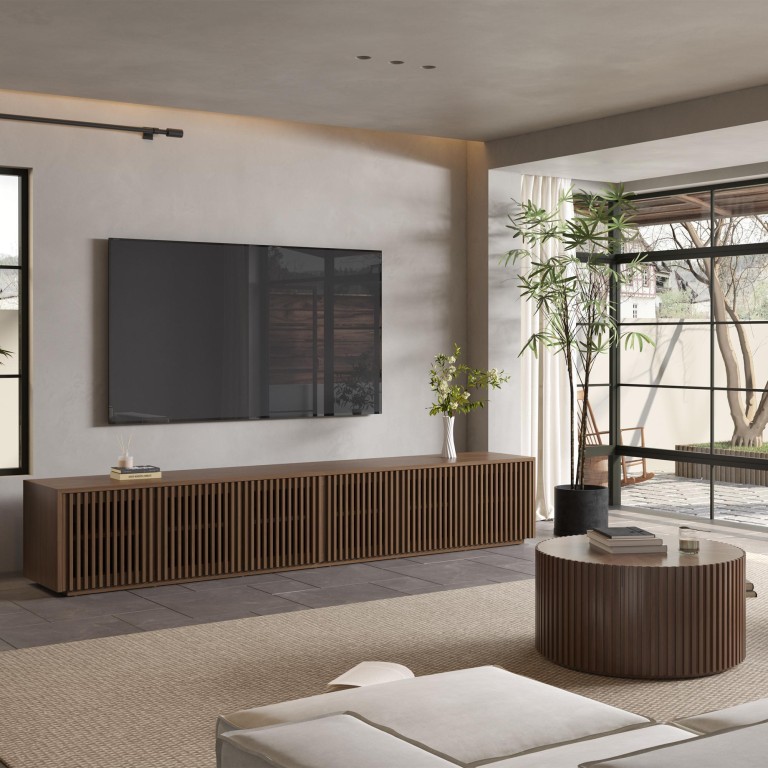 The TV stand is characterized by its vertically slatted design. Inspired by classic architectural elements, the fence-like slats create a rhythmic pattern with clean lines, making a room look organized and refined. The rich wood finish gives the whole room a warm and elegant touch, making the piece work well with many different interior styles.