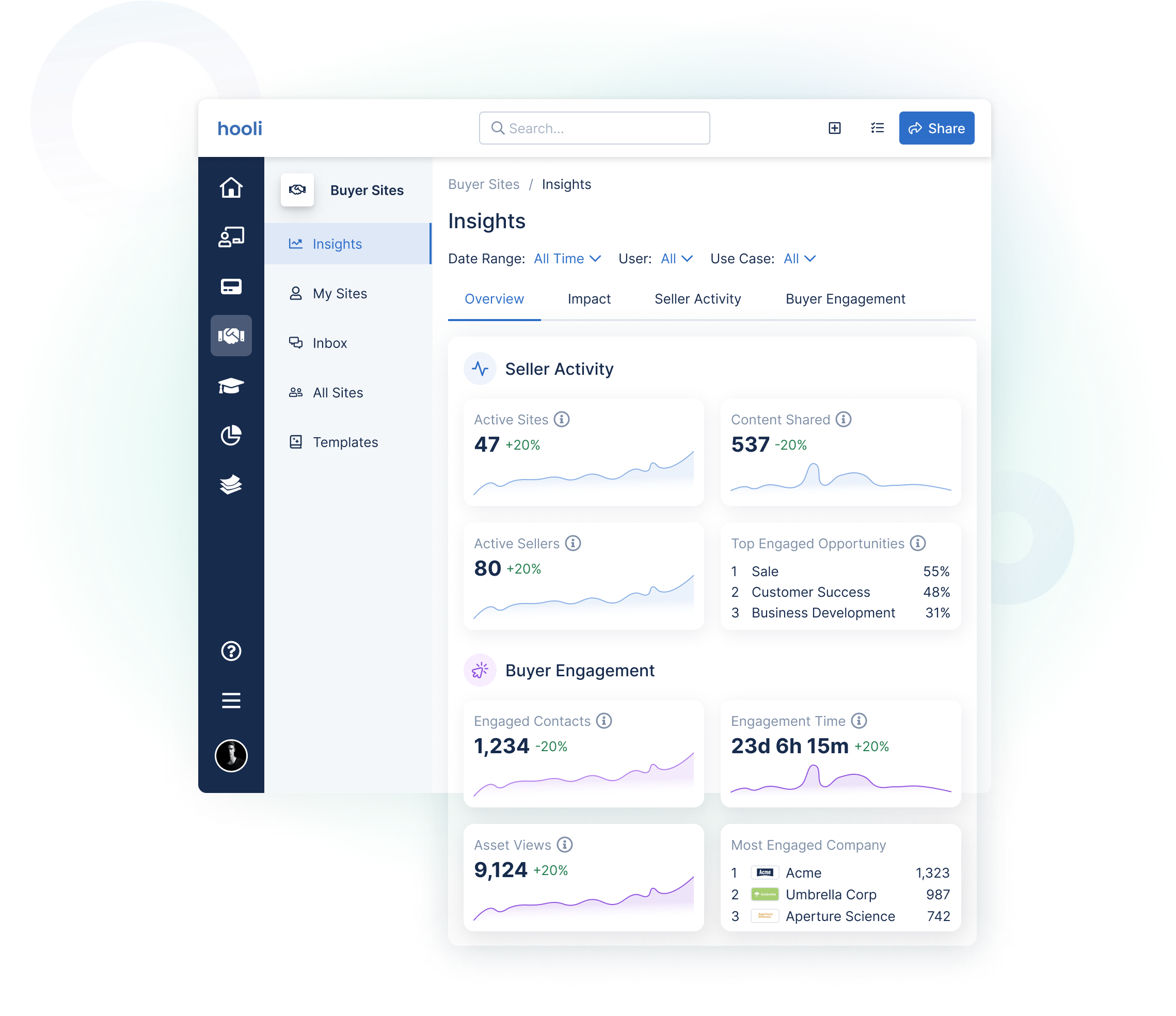 - Contact Engagement Insights: Sellers and customer success teams share content with decision-makers and stakeholders through personalized Digital Buyer Sites, measuring buyer engagement and validating buying sentiment.