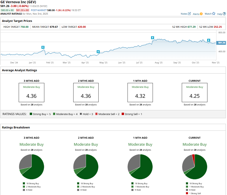 Among the 28 analysts covering the GEV stock, the consensus rating is a “Moderate Buy.” That’s based on 18 “Strong Buys,” one “Moderate Buy,” eight “Holds,” and one “Strong Sell.”