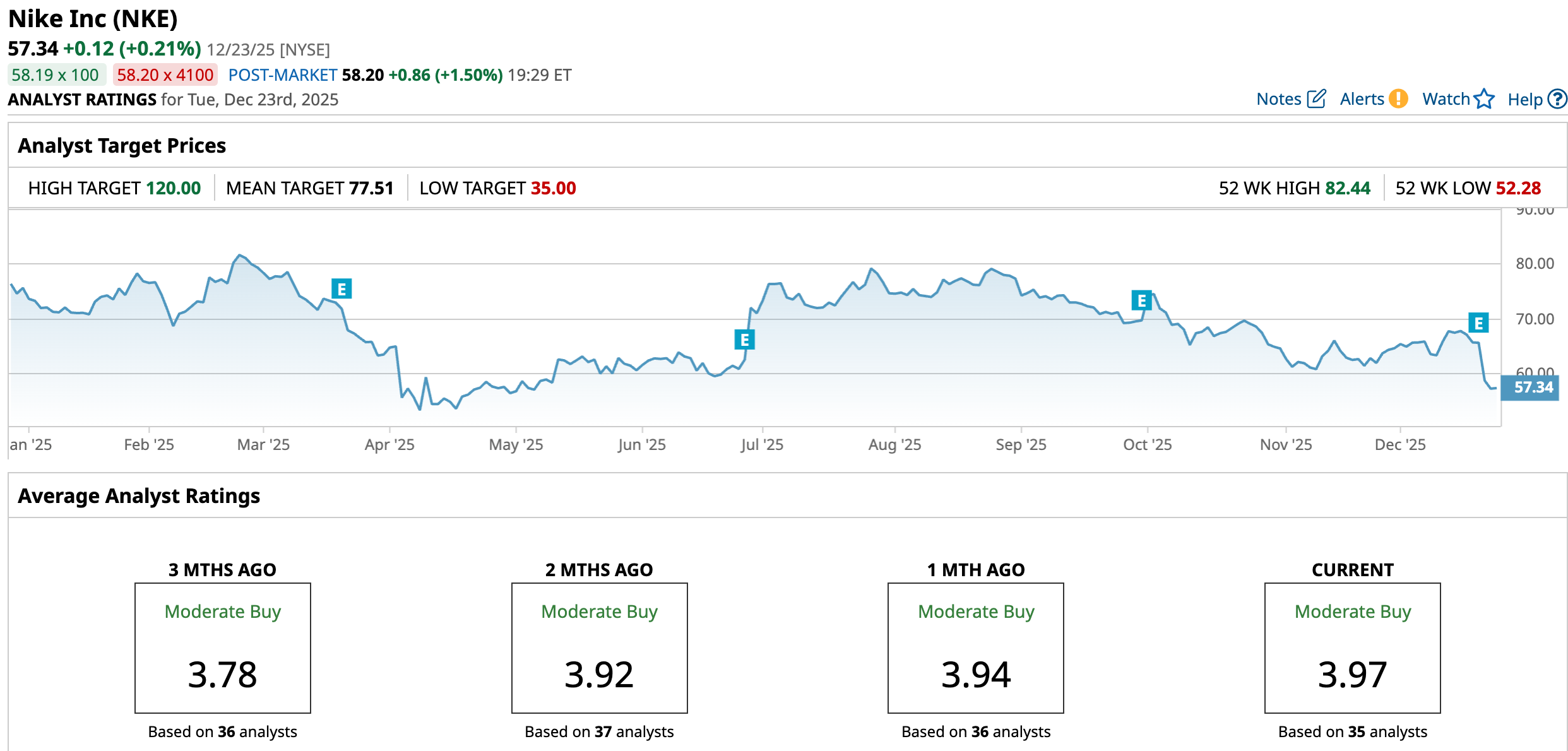 NKE is trading at $57.34 as of Dec. 23, down 24.22% year-to-date (YTD) and 25.3% over the past 52 weeks, keeping the stock firmly in “dip” territory for 2026‑focused investors.