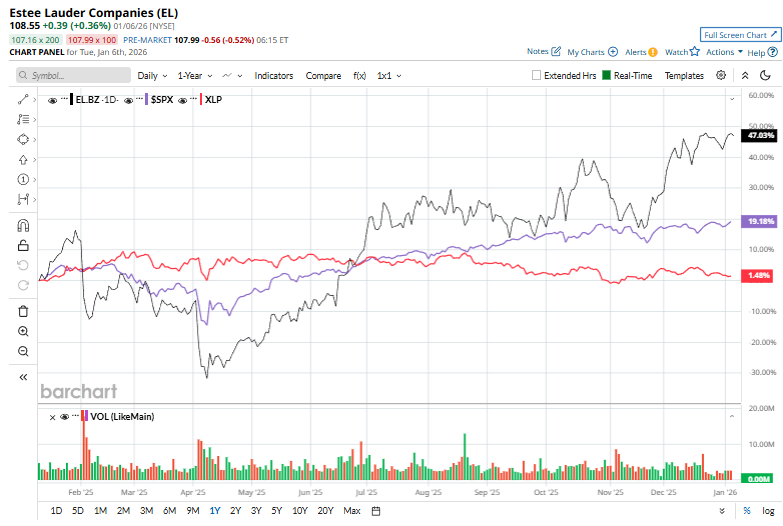 EL stock has surged 47.6% over the past 52 weeks, outpacing the S&P 500 Index’s ($SPX16.2% surge and the Consumer Staples Select Sector SPDR Fund’s (XLPmarginal decline over the same time frame.