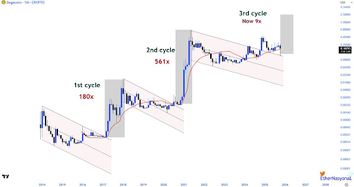 Market watcher EtherNasyonaL shared that Dogecoin gained 180 times in its first cycle and over 500 times in its second, suggesting that the current phase might still be early in its trajectory. Analyst Javon Marks even predicted that DOGE could see a 250% surge if the current chart structure plays out, putting future price targets between $0.70 and $0.80.