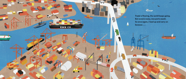 Come aboard a container ship and voyage across oceans to deliver goods to people who need them. In a dramatic journey, the crew encounters a stuck ship in a canal, reroutes, and weathers a mighty storm. Rhythmic text from debut author Kelly Rice Schmitt and delightfully detailed illustrations from Jam Dong will keep readers riveted and eager to learn more about container ships, geography, and global trade.