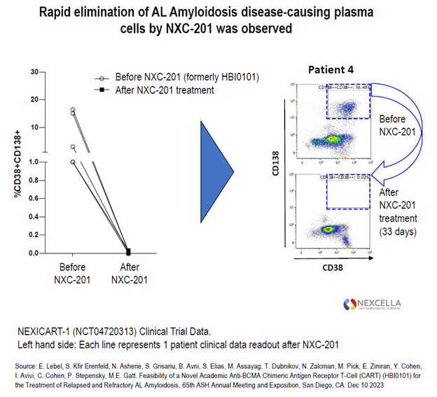 LOS ANGELES, Dec. 11, 2023 (GLOBE NEWSWIRE) -- Nexcella, Inc. (“Nexcella”, “Company”, “We” or “Us”), today announced new clinical data from its Phase 1b/2a NEXICART-1 (NCT04720313) study of novel, autologous, BCMA-targeted chimeric antigen receptor T (CAR-T) cell therapy, NXC-201, in patients with relapsed/refractory AL Amyloidosis (R/R ALA) at an oral presentation by study investigator Moshe E. Gatt, MD at the 65th American Society of Hematology (ASH) Meeting being held in San Diego, CA. The updated results include follow-up and clinical data from one new patient. All patients were relapsed/refractory to standard-of-care Dara-CyBorD (daratumumab combined with cyclophosphamide, bortezomib, and dexamethasone) and had experienced a median of 6 prior lines of therapy that failed to stop worsening of disease prior to receiving NXC-201.
