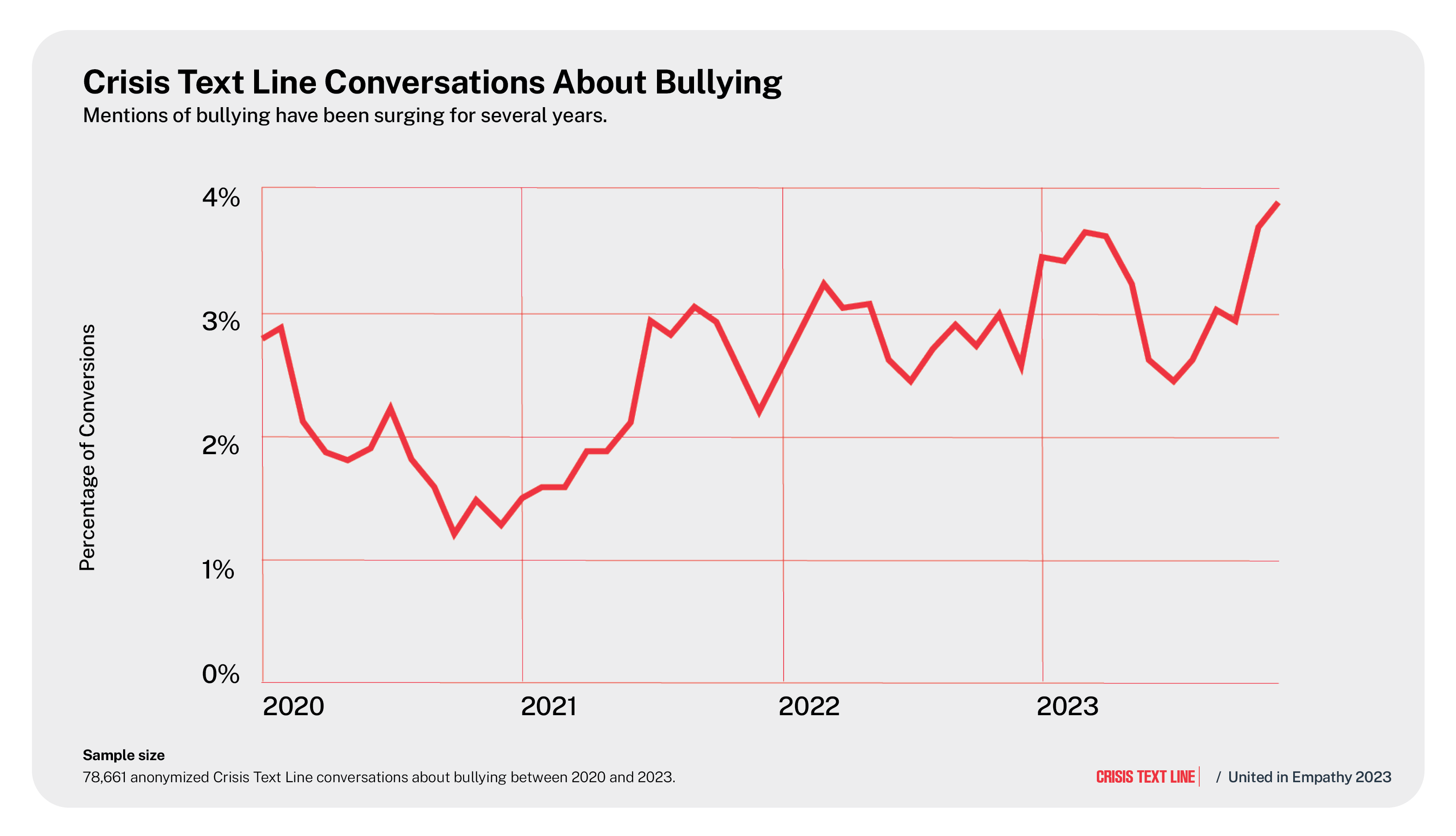 New York, April 16, 2024 (GLOBE NEWSWIRE) -- Crisis Text Line, a national nonprofit organization that provides free, 24/7, confidential mental health support in English and Spanish, today announced the release of its fifth annual United in Empathy Report, sharing new insights on the state of mental health in 2023. Crisis Text Line analyzed 1.3 million anonymized conversations with people in crisis – the majority under the age of 25 – to uncover the top mental health issues, stressors and coping strategies.
