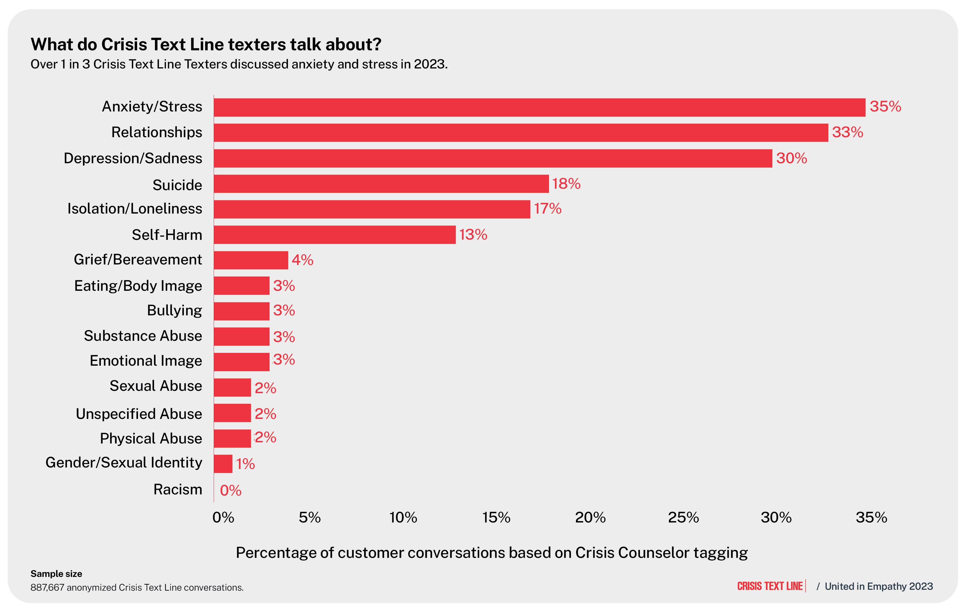 In 2023, anxiety and stress was the most prominent topic of Crisis Text Line conversations as over 1 in 3 texters discussed it. Two years post-pandemic, we are seeing stress and anxiety levels increase again. Anxiety and stress were followed closely by relationships (34%); depression and sadness (30%); suicide (18%); and isolation and loneliness (17%).