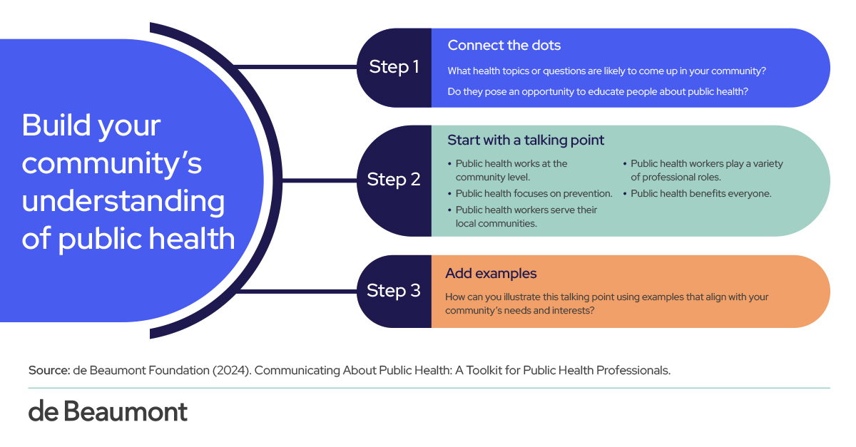 “By communicating about specific health topics in a way that’s easy for people to understand and act on, public health professionals can make their communities healthier and safer,” said de Beaumont president and CEO Brian C. Castrucci, DrPH. “But public health organizations often struggle to convey the overarching goals and core concepts of their work, and that can lead to confusion and distrust, especially in an environment with politically driven narratives, misinformation, and a general distrust of government.”