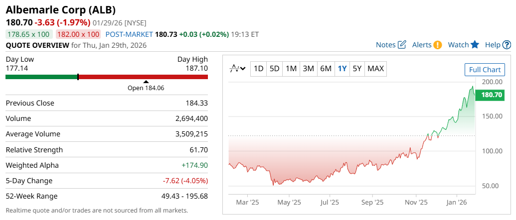 Meanwhile, a consensus among 26 analysts rates the stock a “Moderate Buy” with as much as 16% upside if ALB stock reaches its $210 high target.